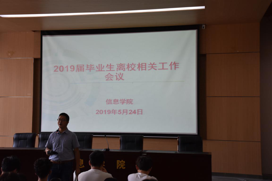 2019年5月24日上午,信息学院在睿智4号楼111报告厅召开了2019届毕业生离校工作推进会,学院党委副书记刘德鹏,辅导员蔡文华、徐旻、刘萌、陈思行,以及全体毕业生参加了此次会议。