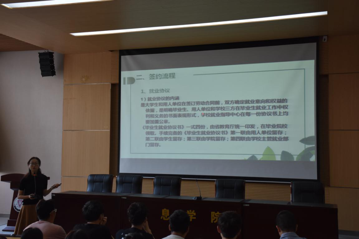 辅导员蔡文华老师向毕业生详细介绍了毕业离校手续办理流程、个人档案寄送及查询、就业协议的签订细节、就业信息统计、毕业生帮扶政策、毕业生安全注意事项等方面的内容。并提醒毕业生,在离校前要继续保持良好的精神面貌,按照学校和学院的统一安排完成相关手续,遵守校纪校规,善始善终,安全、文明、有序离校。