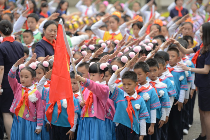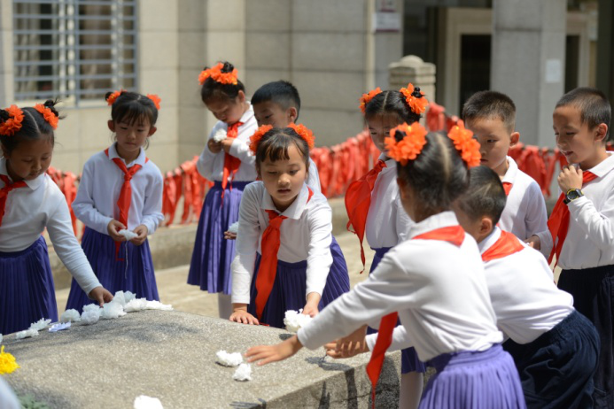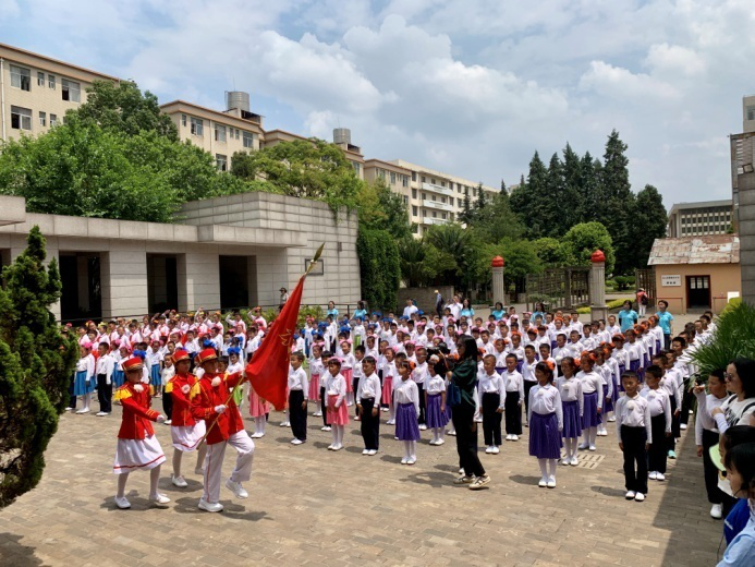 队歌嘹亮,领巾飘扬。在2019年六一国际儿童节到来前一周,来自437必赢会员中心附属小学1600余名一年级学生在老师的带领下,来到437必赢会员中心校园内的西南联大旧址“一二·一”运动四烈士墓前,开展瞻仰革命先烈、祭扫烈士陵园活动,并在这里举行少先队入队仪式。