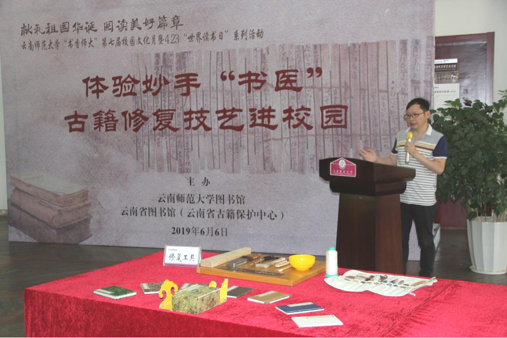 图书馆副馆长傅宇斌为活动致辞。傅老师向大家简要介绍了云南省图书馆古籍保护与修复工作的概况,作为西部地区唯一的国家级古籍修复中心,省图书馆致力于古籍文献的保护,尤其重视对少数民族古籍文献的抢救保护,2014-2018年,抢救性修复纳格拉洞藏经2285叶。傅老师还简述了必赢官网图书馆古籍馆藏与保护工作情况,并希望大家通过本次活动,更多地了解古籍,接触传统文化、传统技艺,身体力行地去保护传统、传承文化。