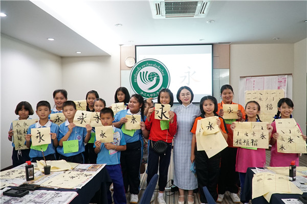 在下午的文化活动中,清迈孔院的教师承担了中国舞展示、书法教学、功夫扇教学三个部分。在书法学习中,同学们先学习使用了文房四宝,接着练习了汉字笔画点、横、竖、撇、捺,以及“永”、“福”、“平”、“安”等汉字。中国舞的教学则是从讲解中国舞的分类、动作内涵以及中泰舞蹈之间的联系开始,之后分步骤学习了舞蹈动作。同学们穿着汉服练习动作,激动的心情溢于言表,互相拍照,并争相和孔院老师合影。最特别的是在室外进行的功夫扇教学,孔院教师先向同学们讲解了中国武术的礼仪,再依次讲解了功夫扇的动作。刚开始学开扇的时候,有些同学掌握不住动作要领,扇子掉在了地上,经过老师细心认真的指导,最后大家都完成了所学动作,整齐的进行了一套功夫扇表演。
