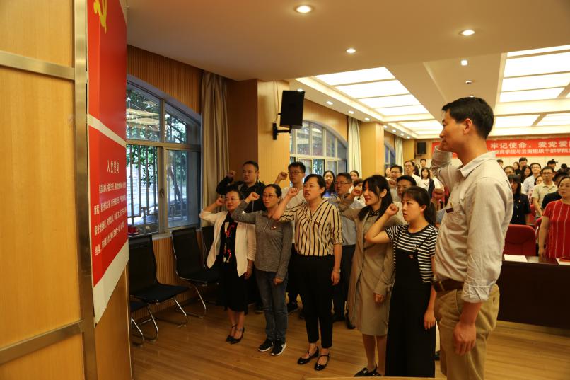 师生党员张晓磊、刘云飞、肖本红、杨慧宾的诗歌朗诵《我有初心一颗,照亮山河万朵》拉开了主题党日活动序幕。活动为政治生日在6月的12名党员过了一次有纪念意义的集体生日。在泛亚商学院党委书记陈玉林的带领下,12名党员面对党旗,庄严宣誓,重温入党誓词。省委组织部云南组织干部学院副院长徐坚、王正和437必赢会员中心党委组织部部长蔡金红为过政治生日的每一位党员赠送了“政治生日”纪念卡。