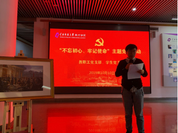 守初心——颂时代旋律心得分享环节,由师生党员代表王蔚博士、朱岚茎老师、王坚同学分别进行心得体会交流发言。从新中国成立70年奋斗历程到新时代共产党员的责任与担当;从爱岗敬业、立德树人的信念到奋发图强、锐意进取的追求,党员们从多层面诠释了要“不忘初心、牢记使命”。并结合自己的思想成长寄语入党积极分子要把“不忘初心、牢记使命”贯穿在专业学习、班级建设、社会实践等各个环节。