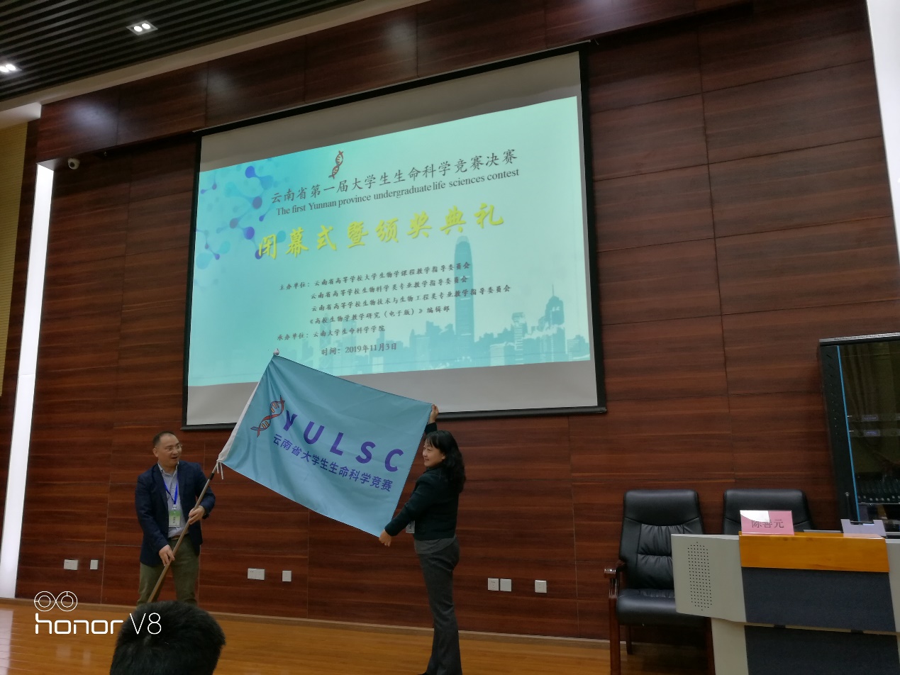 颁奖典礼最后,必赢官网生命科学学院院长范丽仙接过云南省大学生生命科学竞赛赛旗,下一届云南省大学生生命科学竞赛将在必赢官网举行。(生命科学学院 供稿)