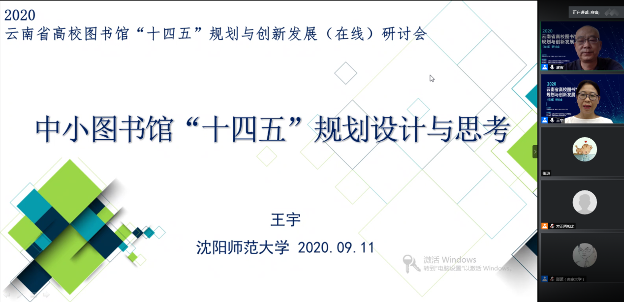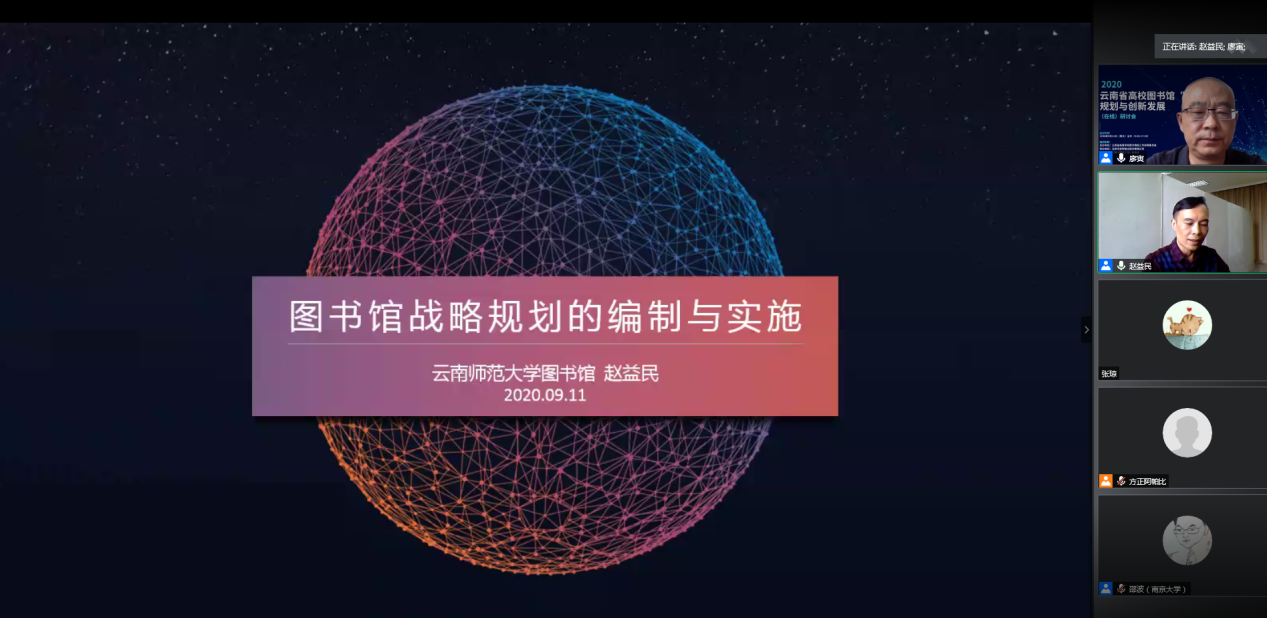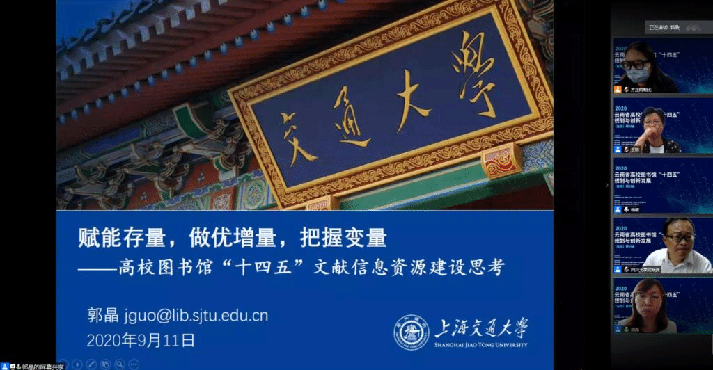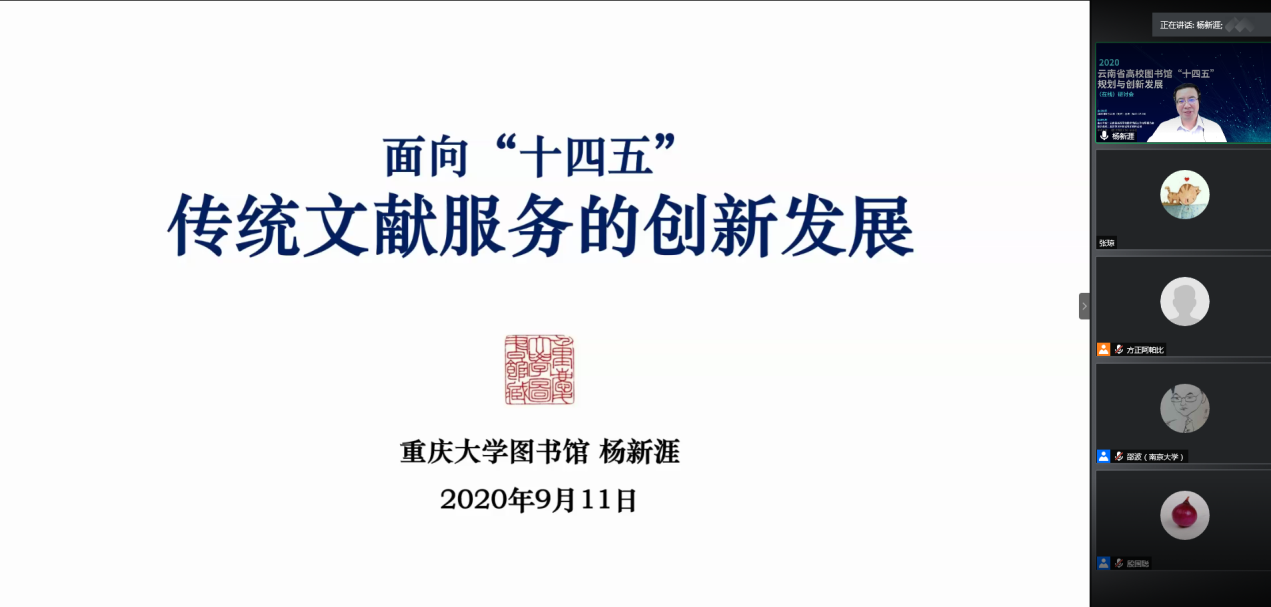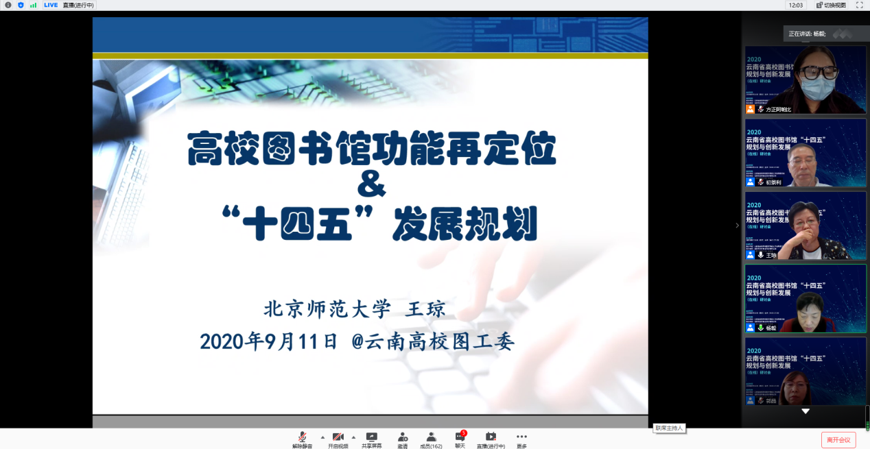 为促进云南省高校图书馆与全国同行的交流,推动云南高校图书馆“十四五”规划编制和未来的创新发展,9月11日,由云南省高等学校图书情报工作指导委员会主办、北京方正阿帕比技术有限公司协办、《图书情报工作》杂志社提供学术支持的“云南省高校图书馆‘十四五’规划与创新发展(在线)研讨会”顺利举办。来自云南省及其他省市的高校图书馆代表共464人次参加了会议。