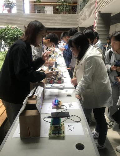 本次竞赛历时3个月,共举办各类培训会、实训实作等13次,参与人数145名,参赛学生人数多,覆盖面广。参赛作品有红外避障循迹小车、环境监测仪、超声波倒车雷达、智能电子称、简易电子琴、光立方、数字时钟、简易计算器等,种类多样,紧贴实际生活,通过参赛同学的讲解与演示,得到了在场师生和评委们的一致好评,充分体现了同学们的专业设计水平和科学创新精神。