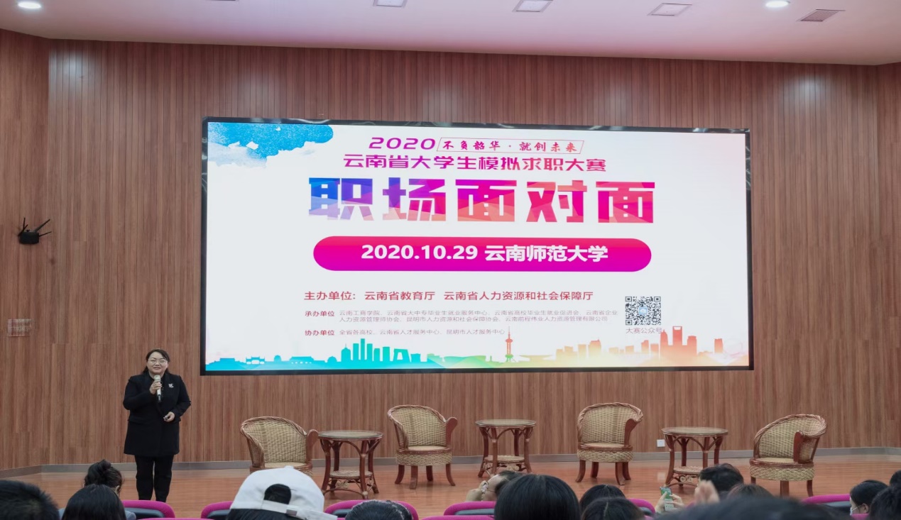 2020年10月29日下午,云南省2020年大学生模拟求职大赛系列活动“职场面对面”在呈贡校区汇学2栋101报告厅举行。该活动是云南省教育厅和云南省人力资源和社会保障厅主办的“云南省2020年大学生模拟求职大赛”的重要组成部分,由省级就业主管部门领导、高校就业指导老师、企业人力资源专家到校围绕职业环境、就业准备、择业技巧等方面与同学面对面开展指导和交流活动。