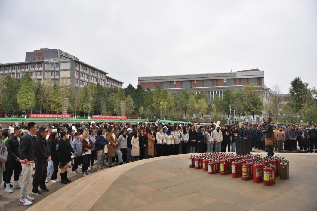 2020年11月9日中午,保卫处、校医院和后勤保障服务中心相关科室人员,各学院副书记、辅导员及1000余名学生在呈贡校区东区文聚2幢公寓和贝壳广场开展了学生公寓安全疏散和灭火演练。