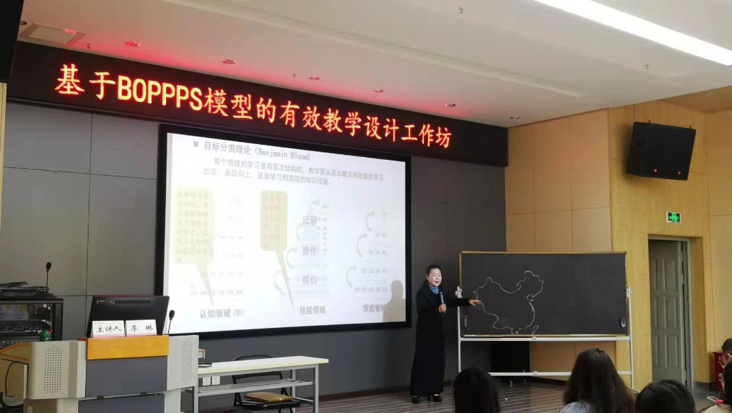 前置工作坊主要内容为学习BOPPPS有效教学模型的六要素和设计方法。李琳教授以目标分类理论为重点,结合多个教学设计案例,为参训教师们介绍了BOPPPS六要素(Bridge- in引入;Objective目标;Pre-assessment前测;Participatory Learning参与式学习;Post-assessment后测;Summary总结)以及基于BOPPPS模型的教学设计方法。李琳教授翔实生动而充满激情的讲授以及寓教于乐的游戏式教学方式博得了在场教师们的阵阵掌声,引起了老师们的强烈反响。很多老师对后续的迷你教学演练充满期待。