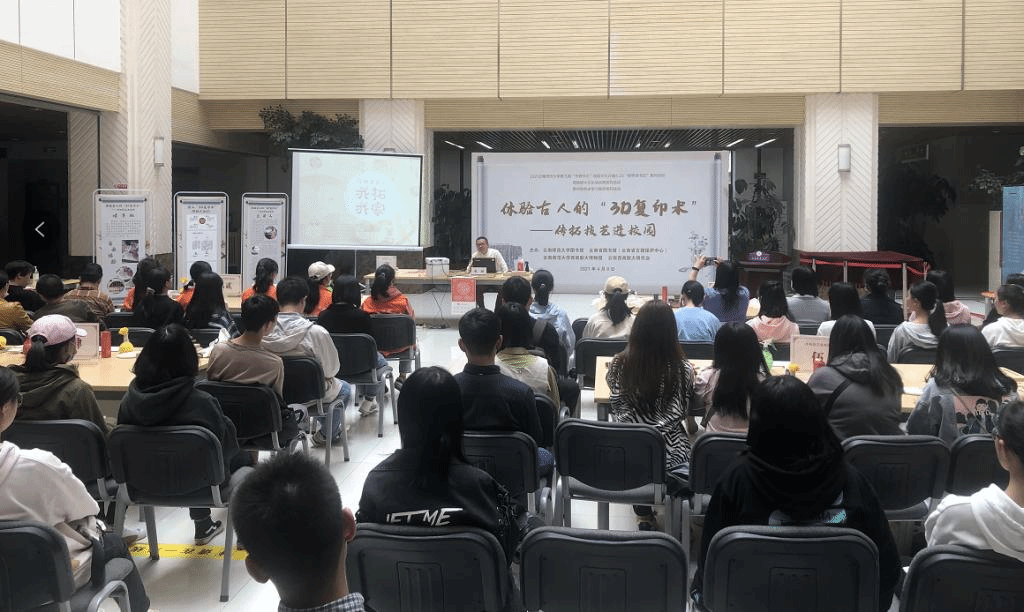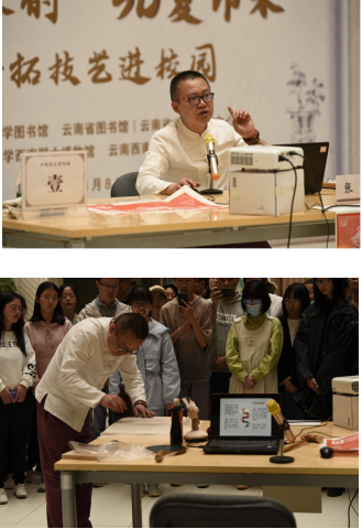 昆明市非物质文化遗产传拓技艺代表性传承人、云南省图书馆古籍修复保护传拓研习馆副馆长张衡以“万物可拓之我拓我家”为题,介绍了传拓技艺的演变历史、上墨技巧等知识,并现场演示了墨拓操作流程。讲座期间,张衡副馆长与师生观众互动活跃,现场气氛热烈。