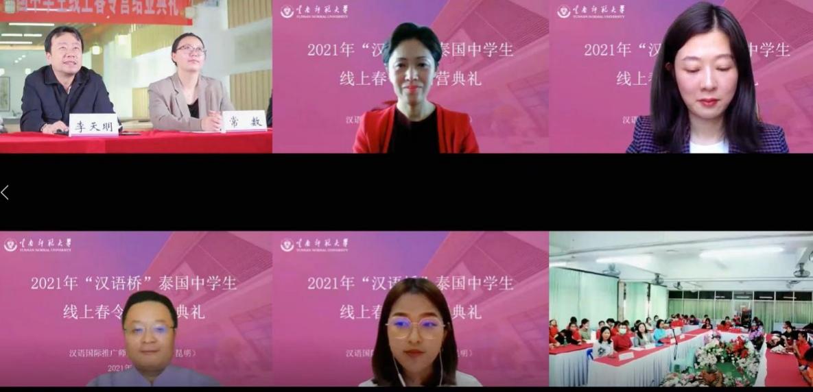 4月10日,国际汉语教育学院举办的2021“汉语桥”泰国中学生线上春令营在必赢官网呈贡主校区同析2号楼、泰国拜县中学大礼堂和清迈大学孔子学院会议室举行结营典礼。国际汉语教育学院党委副书记常数、副院长李天明,拜县中学副校长金达女士,清迈大学孔子学院中方院长沈毅等多位领导出席,437必赢会员中心汉语国际推广师资培训基地(昆明)、学院留学生招生外事办公室、拜县中学教师代表以及线上春令营全体同学参加了典礼。