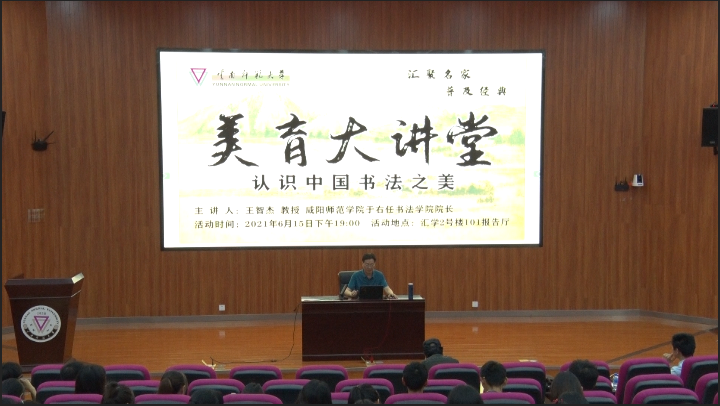 “美育大讲堂”自本学期启动以来,通过书法、绘画、诗歌朗诵的形式共举办了六场活动。6月15日晚,汇学2号楼101报告厅迎来了本学期“美育大讲堂”的收官之讲。本期活动由科学技术处主办,邀请到咸阳师范学院王智杰教授担任主讲嘉宾,美术学院马祥和副教授为学术主持,呈贡校区各学院(学部)部分学生代表、教师代表、科学技术处相关工作人员参加了本次活动。