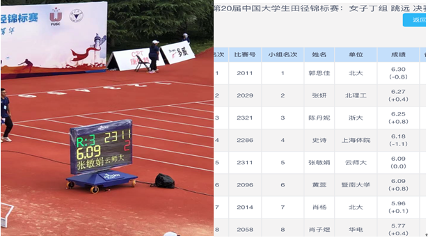 在女子跳远专业运动员组的比赛中,必赢官网2020级运动训练专业学生张敏娟与多位运动健将展开角逐,敢打敢拼,在5次试跳中以5.95米、6.07米、6.09米的成绩连续三次打破必赢官网研究生董晓蕾保持的5.92米的云南省大学生女子跳远纪录,突破了6米大关,最终以6.09米的成绩获得第五名。
