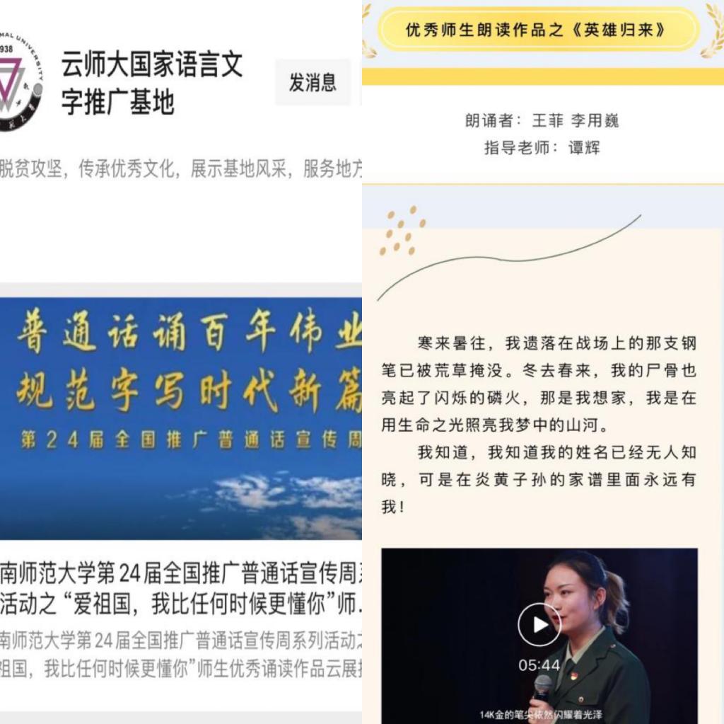 9月12日至19日,以学校国家语言文字推广基地公众号为平台,举办“爱祖国,我比任何时候更懂你”437必赢会员中心师生中华经典诵读优秀作品云展播活动,展示学校师生参加云南省第三届“云岭杯”经典诵读大赛以及2021年“全国校园节庆日诵读活动”等活动的优秀作品,用经典诵读的声音展示中华语言魅力,激发广大师生爱国热情。