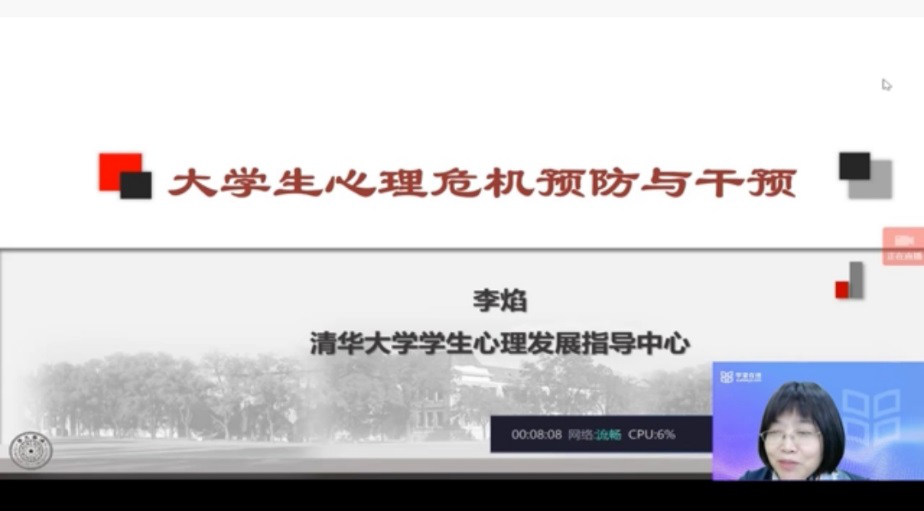 清华大学心理发展中心主任、教育部普通高校心理健康教育专家指导委员会委员、全国高校心理咨询专业委员会常务理事李焰,从心理健康教育与工作要求,大学生的心理状况分析,心理危机五级评估系统,导师的工作策略四个方面,讲授了题为“大学生心理危机预防与干预”的课程。