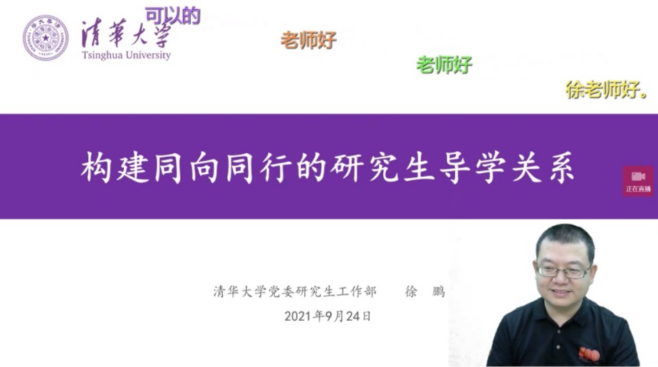 清华大学党委研究生工作部副部长、党委统战部副部长徐鹏,从研究生“导学关系”的定位分析,研究生“导学关系”的现状与影响因素,研究生教育中的学生工作举措三个方面,做了题为“构建同向同行的研究生导学关系”的专题报告。