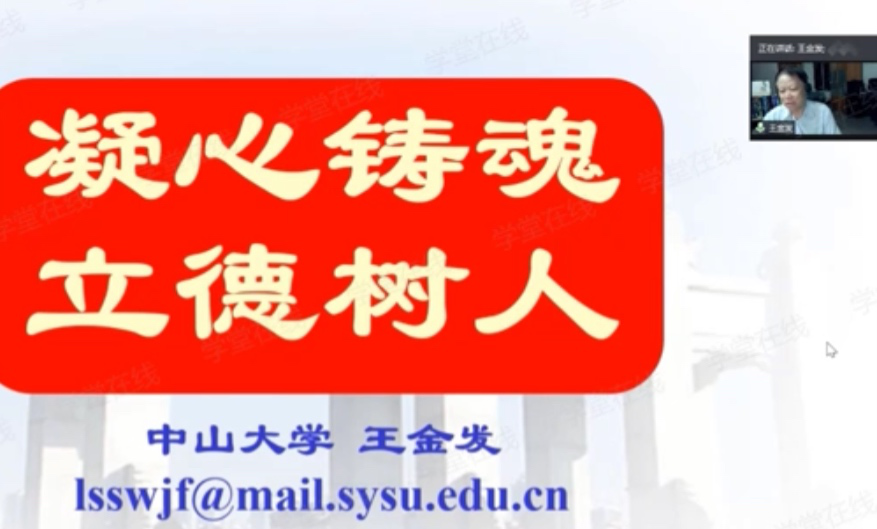中山大学生命科学学院教授、博士生导师王金发,从初心与使命:大学使命、研究生教育,教师精神:师德师风、家国情怀、守住底线,研究生培养立德树人:育人理念、培养目标,Lab meeting,奋斗换幸福五个方面,讲授了题为“凝心铸魂立德树人”的课程。