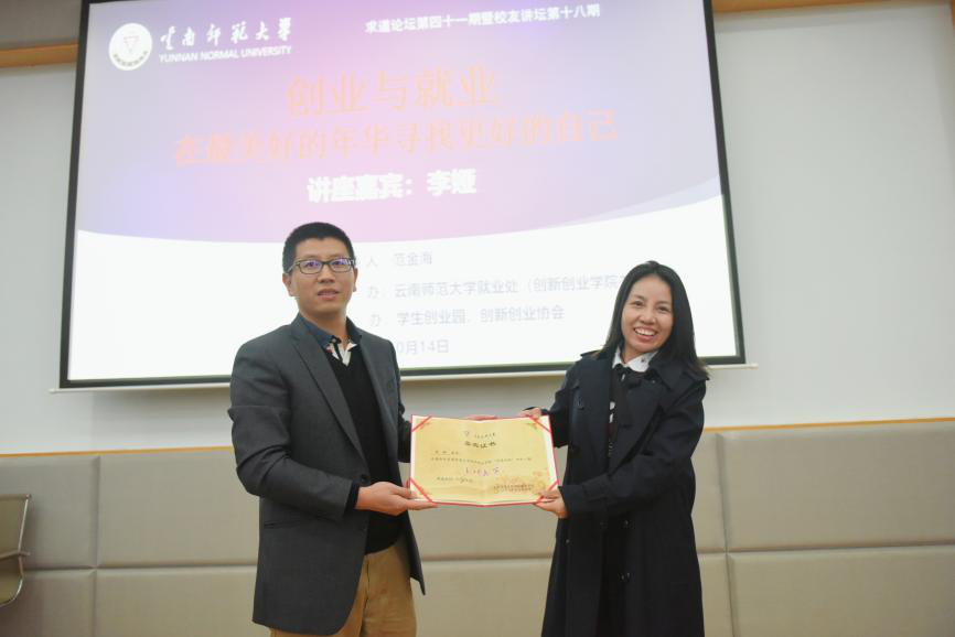 讲座开始之前,创新创业学院办公室副主任李映松老师为李娅老师颁发求道论坛嘉宾纪念证书。随后,李娅老师通过分享自己的学业、就业和创业经历,导入讲座内容,与同学们互动。她谈到,同学们未来的工作并不一定只能从事自己本专业工作,可以有交叉,可以有融合,然而自己的专业是很重要的基石。在职场中,要做好职业生涯规划,一定要学会坚持不懈和学会感恩。同时,创业不易,前期需要在商机、团队和资源方面有大量的积淀。讲座最后,李娅老师还邀请同学进行现场的企业模拟面试,为同学们讲解面试的技巧及HR的关注点。整个讲座过程中,气氛轻松活跃。
