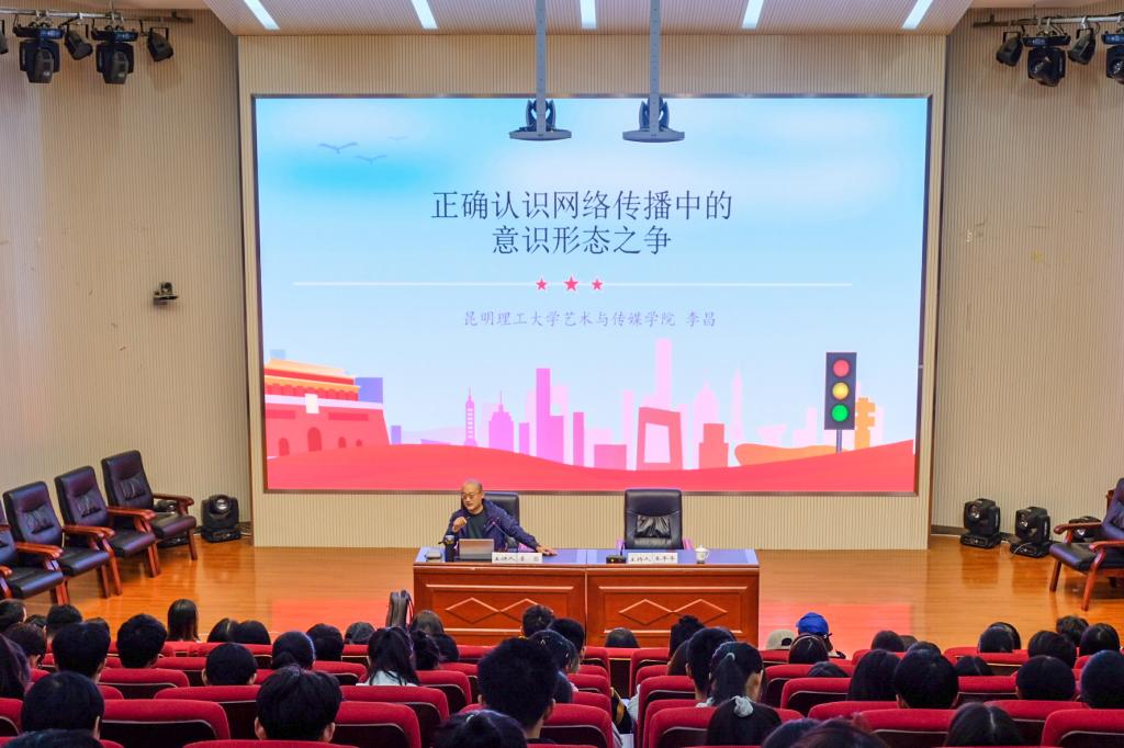 10月28号下午,由中共云南省委宣传部、云南省社会科学界联合会主办,必赢官网团委、传媒学院协办的2021年“云岭大讲堂•云南师大讲坛”第5讲在呈贡校区能环学院107报告厅开讲。昆明理工大学艺术与传媒学院副教授李昌老师以“正确认识网络传播中的意识形态之争”为题作了专题报告,全校青年团学代表240余人参加讲座。讲座由传媒学院党委副书记王平平主持。