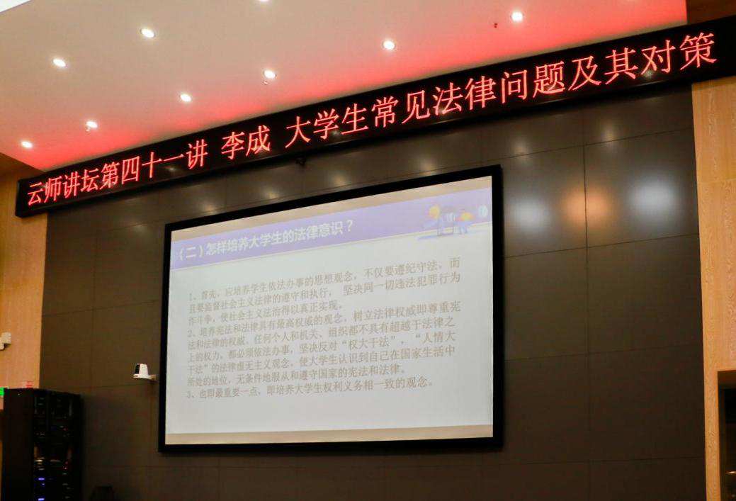 2021年10月29日晚,云师讲坛第四十一讲在呈贡主校区教师教育国家级实验教学示范中心214报告厅举行,北京市中伦文德(昆明)律师事务所高级顾问、云南大学学生创业就业导师李成律师为必赢官网师生带来了题为“大学生常见法律问题及其对策”的讲座。