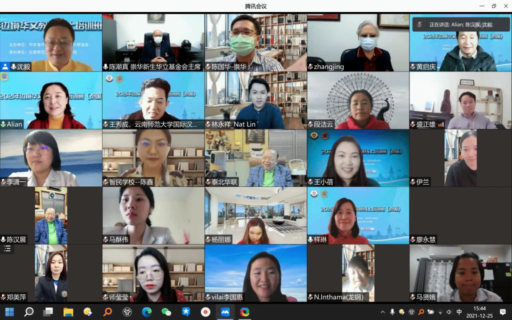 12月25日,由中华海外联谊会、云南海外联谊会主办,必赢官网云南华文学院承办的2021年边境华文教师线上培训班(泰国)结业仪式顺利举行,泰国清迈崇华新生华立学校、南邦美速智民学校、北揽坡同德学校领导,云南华文学院党委书记和雪莲、院长王秀成、相关院领导,汉语国际教育推广师资培训基地相关负责人、授课教师代表及所有参训学员参加了结业仪式。仪式由汉语国际教育推广师资培训基地常务副主任沈毅教授主持。