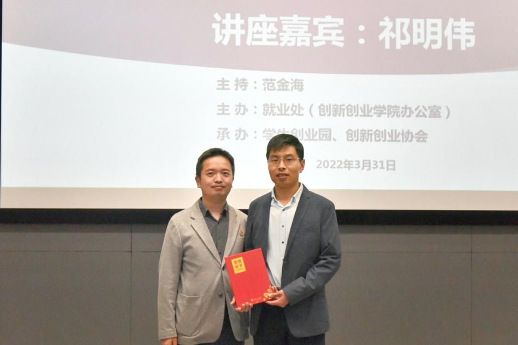 讲座开始之前,就业处明文钦老师为祁明伟颁发嘉宾证书。随后,祁明伟从三个方面开始演讲,第一部分“何为BP”,主讲人简单表明BP即为商业计划书。第二部分“BP的构成”,主讲人展示了商业计划书的三种形式、通用版完整商业计划书的目录以及商业计划书的九项核心内容。第三部分也是本次讲座的主题“从BP看创业”,主讲人结合自身的创业经历,讲述了商业计划书的哪些内容容易“踩雷”,随后从创业项目和创业者两个方面展示了调查数据,使同学们对于创业项目的方向、行业、地域分布以及创业者的年龄、受教育状况、创业经历等更加清晰。