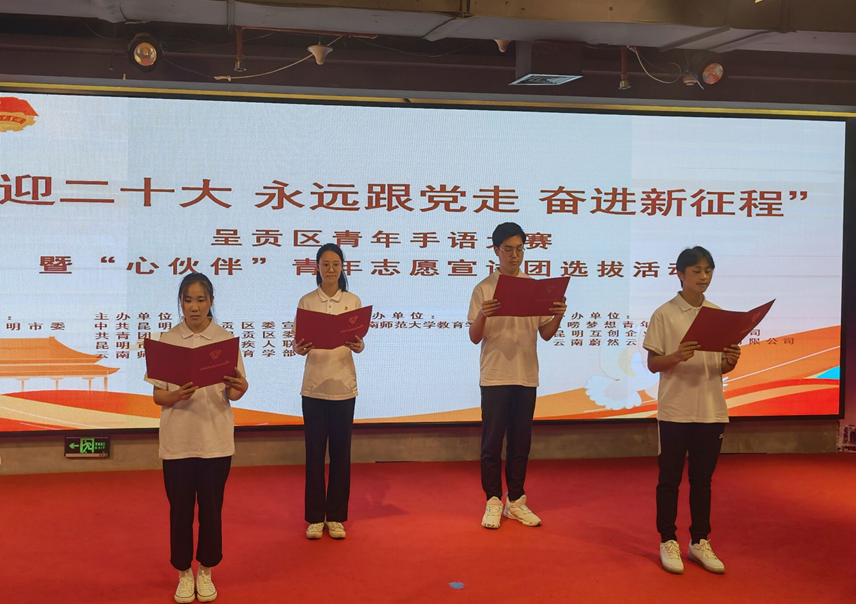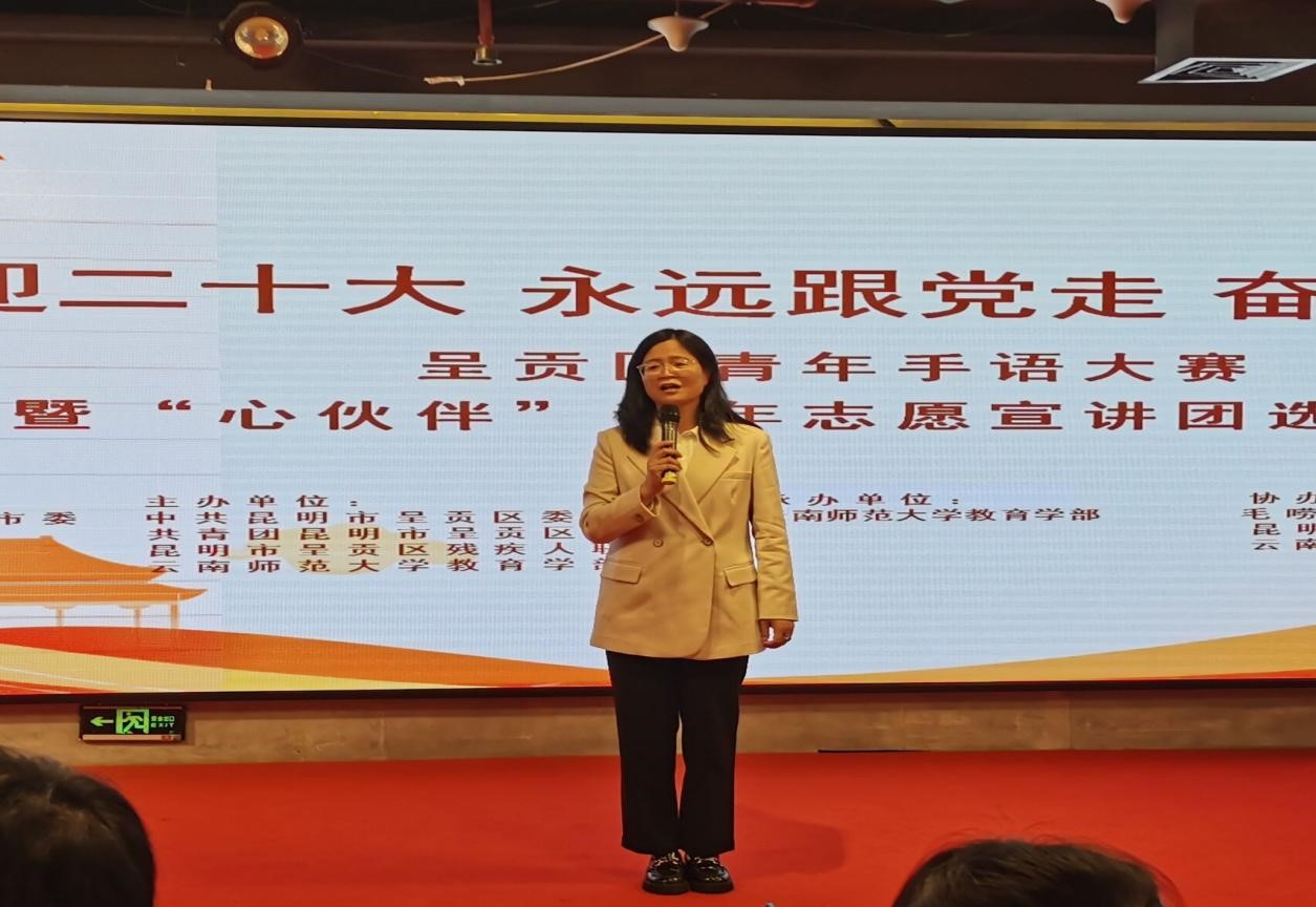 近日,为弘扬“奉献、友爱、互助、进步”的志愿者精神,充分发挥党团共建服务联系点积极作用,呈贡区委宣传部、共青团呈贡区委、呈贡区残联、437必赢会员中心教育学部在昆明妇女创业创新示范中心联合开展“喜迎二十大永远跟党走 奋进新征程”呈贡区青年手语大赛暨“心伙伴”青年志愿宣讲团选拔活动。教育学部特殊教育系副教授张晓燕、团委副书记闫晓飞及110余名学生代表参与此次活动。