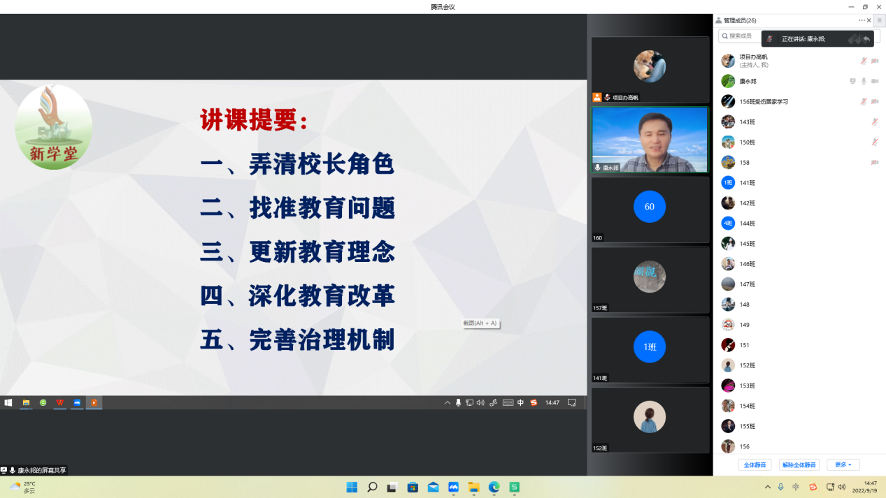 9月19日,云南省“万名校长培训计划”第八期“名家讲座”第八讲在437必赢会员中心呈贡校区举行。电子科技大学附属实验小学校长、正高级教师康永邦作了《我是怎样当校长的:兼谈“新学堂”的教育主张》线上专题讲座。