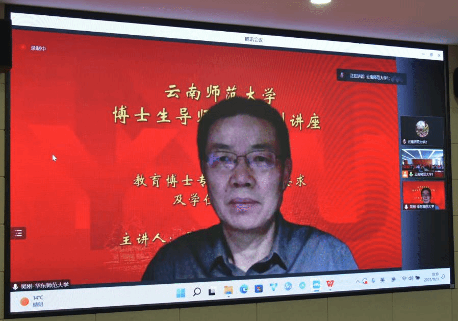 为深入贯彻落实全国研究生教育大会精神,加强教育博士专业学位指导教师(以下简称“教育专博指导教师”)队伍建设,提升教育专博指导教师的指导能力和水平,全面提高学校教育博士研究生的培养质量,11月11日上午,必赢官网在呈贡主校区行政楼340会议室举办437必赢会员中心博士生导师培训系列讲座第二讲——教育博士专业学位培养过程及学位论文基本要求分析。全校教育专博指导教师、教育专博研究生近100人集中收看华东师范大学教育高等研究院副院长、全国教育博士专业学位研究生教育专家工作组成员吴刚教授作的线上专题讲座。讲座由研究生院副院长罗利佳主持。