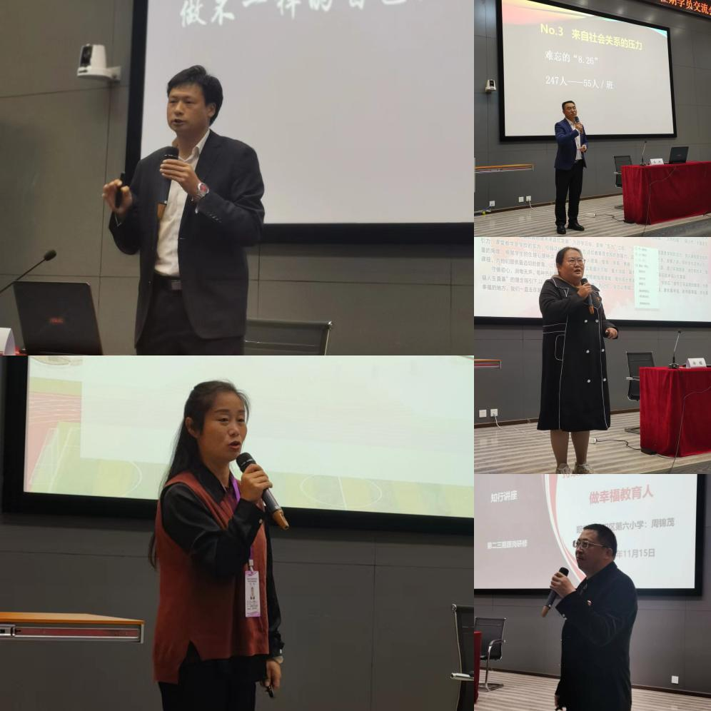 安宁市宁湖小学党支部书记、校长李东昆分享的主题是《创新——从提升感性素养开始》。他从感性素质的差异导致价值观的分歧着眼,提出了提升感性素质的教育方法和教育智慧。曲靖市陆良县西华小学党支部书记、校长余洪分享的主题是《抗压—校长的必修课》。他阐述了校长面临的主要压力,包括安全的压力、质量的压力、临时事务的压力、知识储备不足的压力等几个方面,并和学员交流了舒缓压力的方法。玉溪第一小学副校长、山水校区执行校长李志华分享的主题是《我的教育行思之路》。她从自身的工作经验谈起,提出了教育的三件事,即打底色、壮底气、厚底蕴。她认为教育是浸润,是唤醒,更是一以贯之坚持不懈的工作。并以“当好老师,育好学生,办好学校,做好教育,各美其美,美美与共”的教育宗旨与学员共勉。保山市第二示范小学教育集团党委书记、总校长徐娅分享的主题为《自信从“王婆卖瓜”开始》。她以“王婆卖瓜”的故事为引,与学员探讨培养自信的路径,提出了定期送书、教师培训、读书分享、教研活动、图书漂流、示范引领等培养自信的方法。昭通市昭阳区第六小学副校长周锦茂分享的主题是《持续的教育情怀 实现自我价值》。他认为教师要在工作、生活中争当绿叶,要有才情、有激情、有真情,做一个幸福的人,让人生更加精彩。