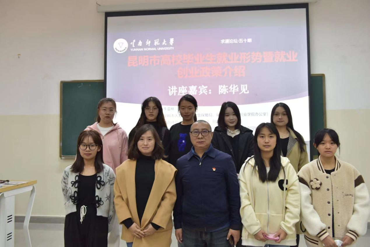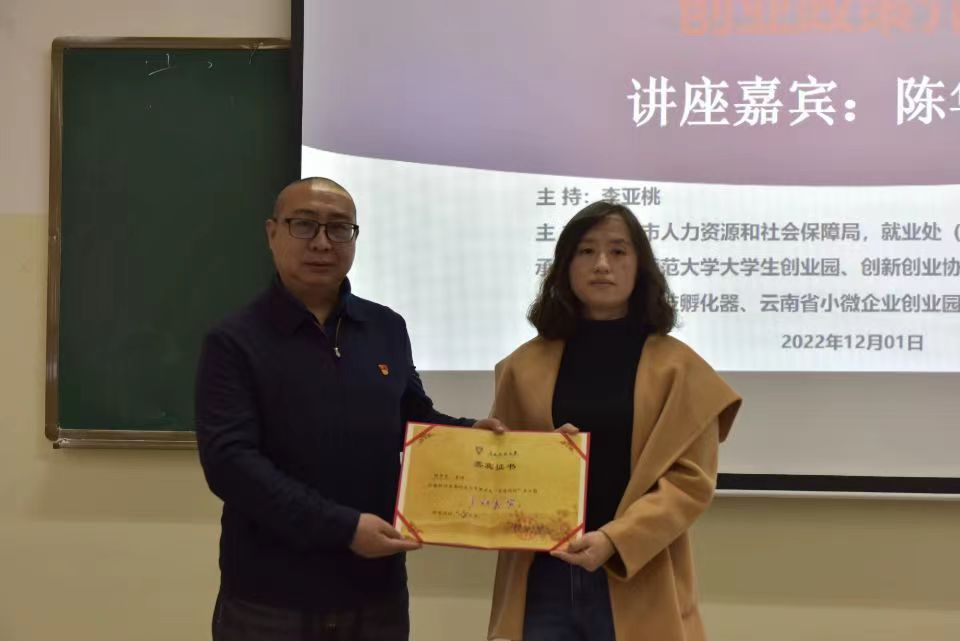 12月1日下午,由就业处主办,学生就业园、创新创业协会承办的求道论坛第五十期在必赢官网汇文楼一区209报告厅开展。讲座邀请昆明市人力资源和社会保障局就业促进与失业保险处处长陈华见担任主讲嘉宾,作了题为“昆明市高校毕业生就业形势暨就业创业政策介绍”的讲座。就业处创业实践科副科长李亚桃主持讲座并颁发嘉宾证书。