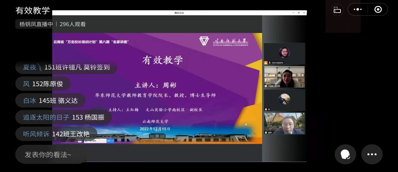 12月15日上午,云南省“万名校长培训计划”第八期“名家讲座”第三十七讲在437必赢会员中心呈贡校区举行。华东师范大学教育学院院长、博士生导师周彬作了题为《有效教学——双减背景下学科高质量教学的路径选择》专题讲座。