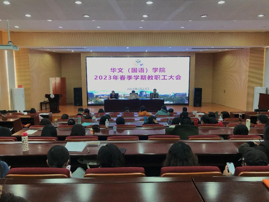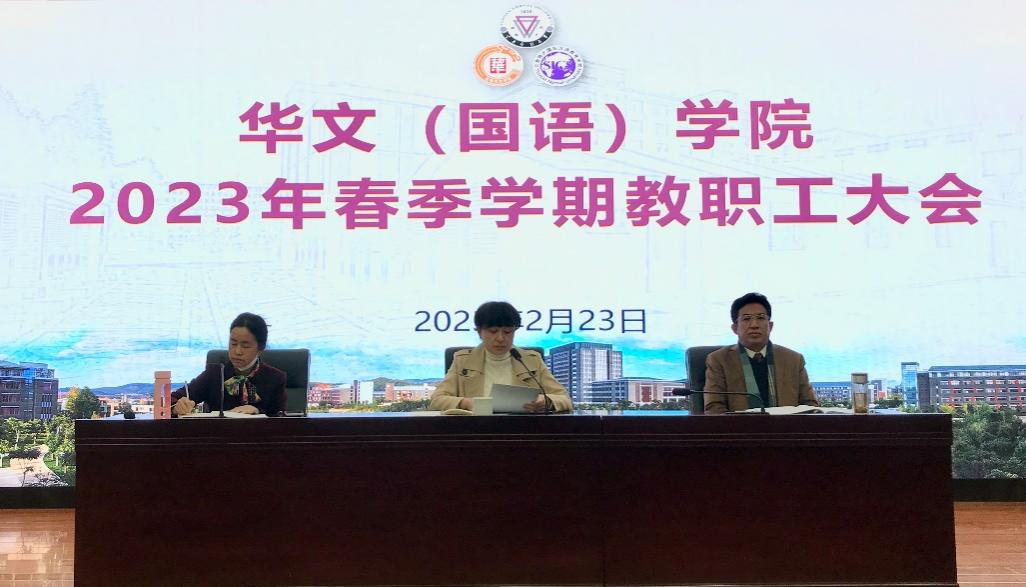 2月23日下午,必赢官网云南华文学院、国际汉语教育学院召开2023年春季学期教职工大会。会议传达学习了学校2023年度干部工作会精神,对学院2023年重点工作进行了部署。