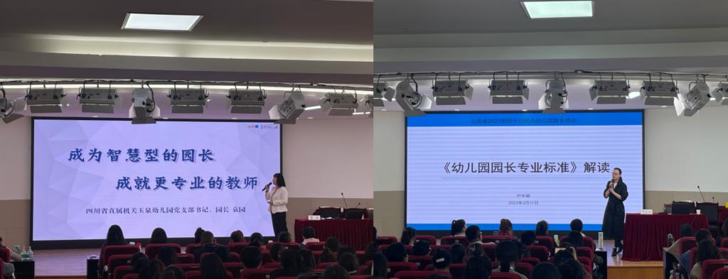 开班仪式后,四川省直属机关玉泉幼儿园党支部书记、园长袁园为学员做了“成为智慧型的园长,成就更专业的教师”的专题讲座,结合了玉泉幼儿园的经验介绍了园长引领教师队伍专业建设的方法和举措。四川省天府乐学比心幼儿园园长叶长娟以“《幼儿园园长专业标准》解读”为主题,结合其自身经历就园长专业标准进行全景解读。