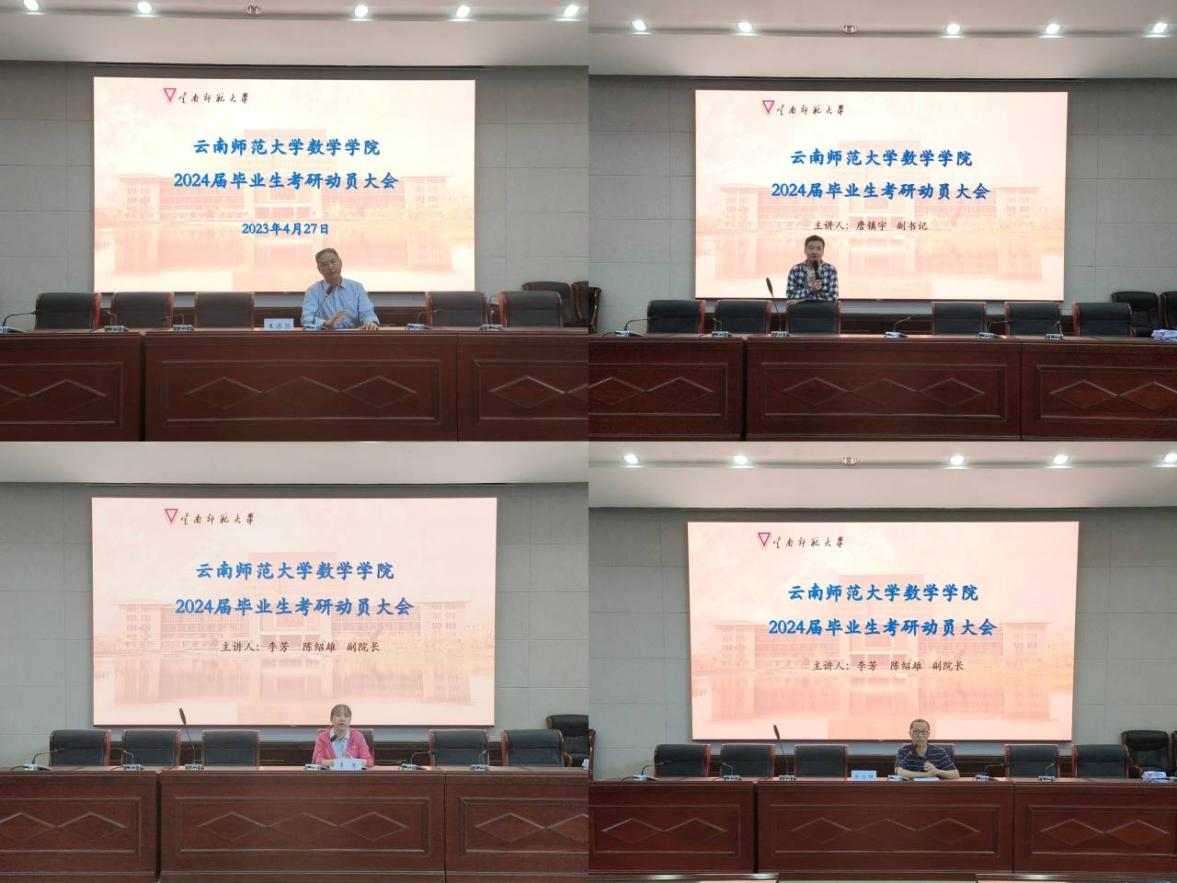 为激发考研学子的斗志,鼓舞学子考研热情,解答同学们关于考研的疑惑。4月27日,数学学院召开了2024届毕业生考研动员。数学学院党委书记王源昌、副书记詹镇宇、副院长陈绍雄和李芳等出席会议。
