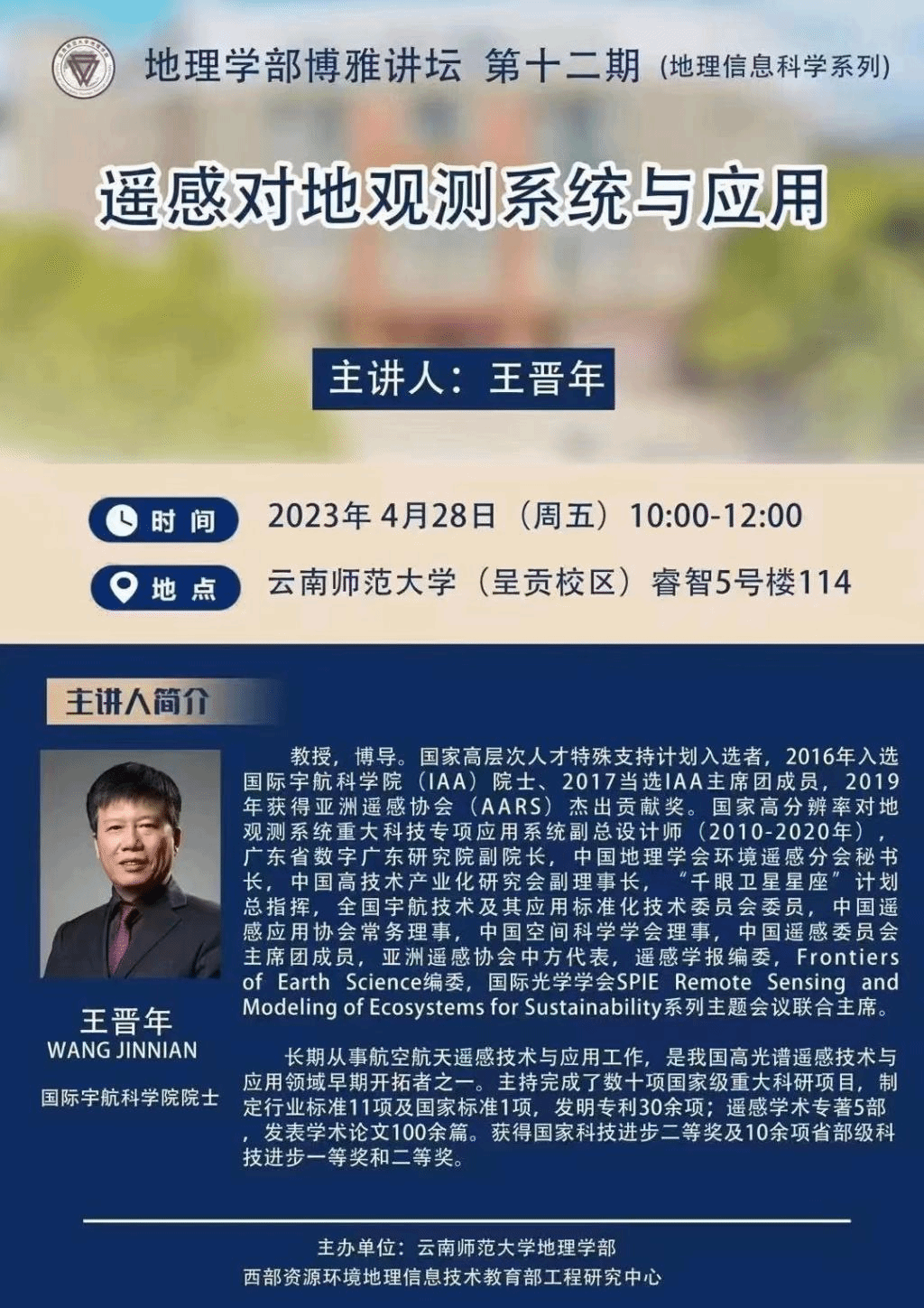 4月28日,国际宇航科学院院士王晋年应邀作为地理学部“博雅讲坛”第十二期主讲嘉宾开展题为“遥感对地观测系统与应用”的报告。报告由学部主任杨昆主持,近200余名师生到场聆听。