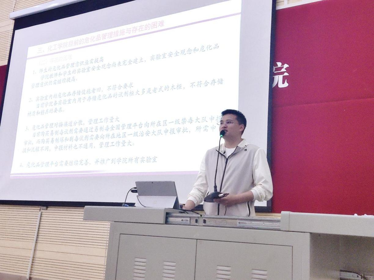 培训会上,化学化工学院高级实验师王帮进老师对近年来全国高校实验室发生的典型危险化学品事故进行了案例分析,对实验室危险化学品管理的相关规定进行讲解阐释,指出了实验室危险化学品管理与使用过程中常见的安全问题,并提出了解决措施。