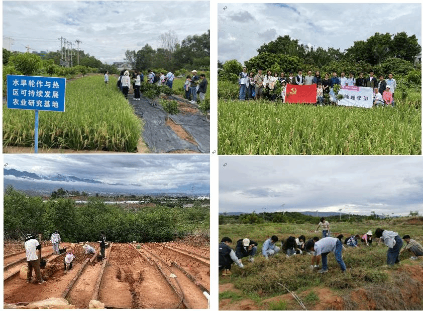 在水旱轮作与热区可持续发展农业研究基地,师生们仔细察看了水稻—果树—蔬菜水旱轮作新型种植模式研究成果,详细了解水旱轮作对改善土壤生态、降低病虫害和提升作物产量的机制机理。在云南省元谋金雷国家水土保持科技示范园,大家依次参观了典型冲沟侵蚀监测与治理区,旱坡地坡改梯综合治理区,水土流失过程监测与机理研究区和水土保持与设施农业综合示范区,详细了解了热区所在金沙江干热河谷区水土流失及生态修复等方面开展的大量富有成效的研究和治理工作。参观之余,师生们还走进实验田,参与劳动活动体验。