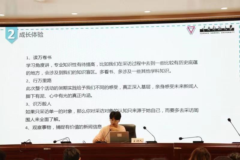 中山大学伍诗云同学侧重介绍了巍山站团队的《十字路口的巍山》等深度报道。437必赢会员中心梁若曦同学分享了团队在南诏博物馆、文华书院等点位的报道脉络及作品发布成果。她认为本次活动搭建了很好的互鉴平台,让新闻学子得以在基层中历练、在历练中成长、在成长中体悟未来新闻人所需要具备的良好素质。