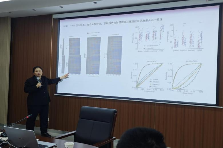 讲座上半场为“内隐序列知识外显转化的神经机制探讨”。围绕个体对序列规则会产生有意识的觉察这一现象,郭秀艳从研究背景逐步深入,引出内隐序列知识的外显转化这一过程背后的神经机制作用等核心问题,最后通过四个实验的具体设计对这些问题进行了回答,并对该主题的研究作了后续的展望。