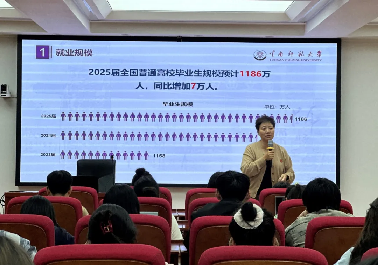 李红从岗位需求变化和就业结构等方面为同学们分析当前就业形势,引导毕业生积极调整就业心态,做好就业准备,并从就业权益维护方面进行了讲解。