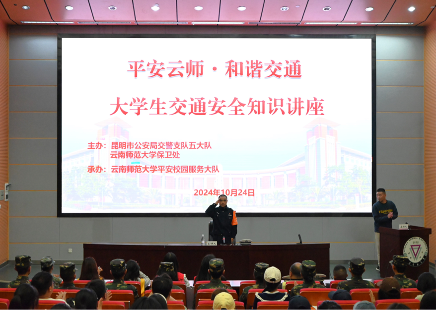 为进一步加强校园交通安全管理,10月24日下午,保卫处以“平安云师 和谐交通”为主题组织开展交通安全宣传培训活动。保卫处副处长顾世辉、昆明市公安局交通警察支队五大队民警皮序东、王磊,学校平安校园志愿服务大队、安保公司人员以及学生代表参加了此次活动。活动分室内讲座和室外培训两个阶段进行。
