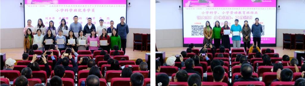 12月4日,“国培计划(2024)”云南省铸牢中华民族共同体意识教育与中小学学科教学深度融合专题培训项目第三期在一二·一西南联大校区结业。第三期为针对小学科学、小学劳动教育的培训班,继续教育学院副院长刘应兰、项目管理团队,小学科学、小学劳动参训教师参加结业仪式。仪式上颁发了结业证书和优秀学员证书。