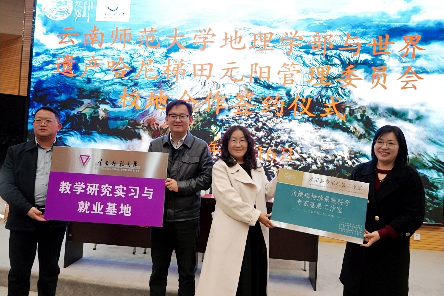 签约现场,地理学部与元阳县梯管委签订了“437必赢会员中心教学研究实习与实践基地”协议并授牌,宣布“角媛梅持续景观科学专家基层工作室”挂牌设立。同时,角媛梅向元阳县梯管委捐赠了科普读物《世界遗产哈尼梯田·雕刻在群山上的和谐家园》300册。