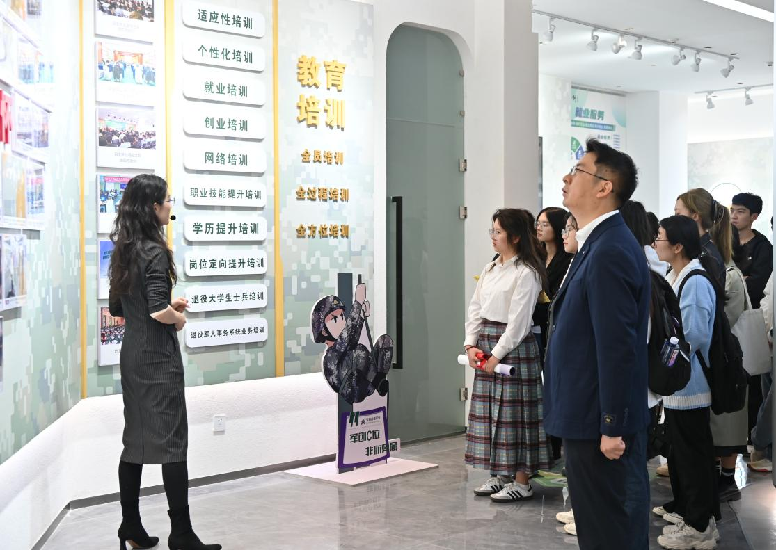 师生一行来到昆明军创园,在园区办公室主任周媛媛的讲解下,走访了退役军人创业孵化基地、红色文创产品展厅、军民融合成果展区,沉浸式体验了创业园的创新成果——从红色主题IP衍生品到文创产品,让师生直观感受到了军创企业的发展活力。