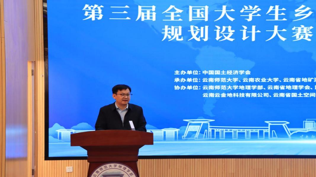 地理学部副主任牛乐德教授代表承办方致辞。他表示,本赛区聚焦云南典型山地村庄,以数字孪生、遥感监测和AI时空分析技术为抓手,探索在国土空间规划“一张图”治理框架下实现产业兴旺、生态和谐、文化赓续的路径。这既是落实乡村振兴战略的生动实践,也是地理学部服务国家“数字中国”与面向南亚东南亚辐射中心建设的重要举措。他希望,参赛选手能融合规划思维与数据智能,把创新方案写在云南大地上。