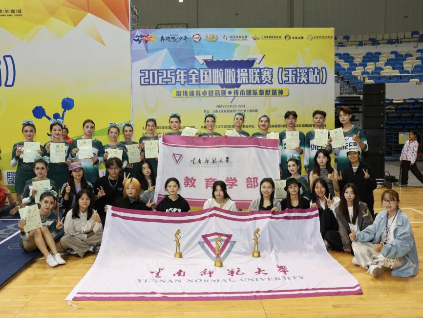 6月21日至22日,2025年全国啦啦操联赛(玉溪站)在云南玉溪高原体育运动中心举办。赛事吸引了全国近2000名啦啦操选手参赛,涵盖幼儿园至大学及专业俱乐部全年龄段,设置花球、街舞、爵士等十余项组别。必赢官网教育学部共组织30名学生参赛,教师傅媛蕾、唐琳和高怡楠担任领队。经过激烈角逐,教育学部代表队获双人街舞自选动作-公开青年乙组第一名、集体街舞自选动作-公开青年乙组第一名、花球规定动作(2020版)1级-公开青年乙组第一名、双人花球自选动作-公开青年乙组第二名的好成绩。