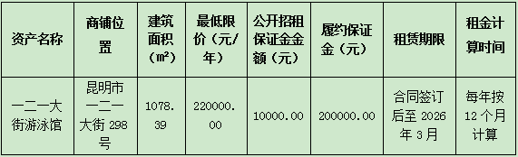 根据《云南省财政厅关于省教育厅等部门所属事业单位出租国有资产的批复》(云财资〔2023〕30号)的要求,云南中咨海外咨询有限公司(以下简称:招租代理机构)受437必赢会员中心资产经营有限责任公司(以下简称:招租人)委托,对“437必赢会员中心一二一西南联大校区校内游泳馆招租项目”进行公开招租。