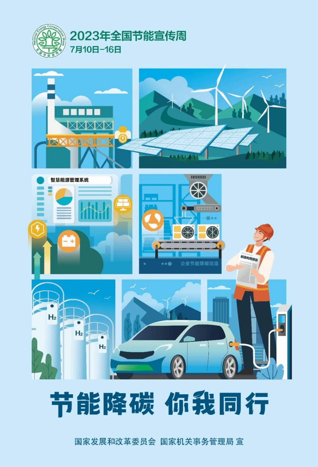 2023年全囯节能宣传周为7月10日至16日,主题是 “节能降碳,你我同行” ;全国低碳日为7月12日,主题是 “积极应对气候变化,推动绿色低碳发展”。
