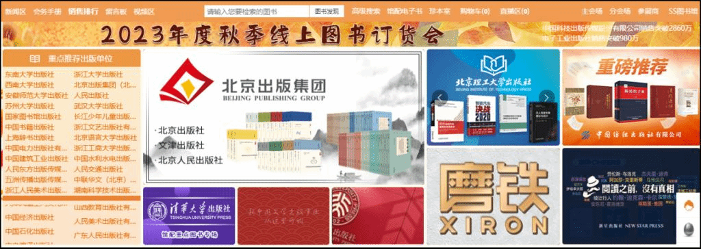 1、主会场:其右上角展示图书采会开幕式领导讲话及平台消息发布。其他板块主要展示重点出版社书目,直接点击出版社名称即可进入选书界面。
